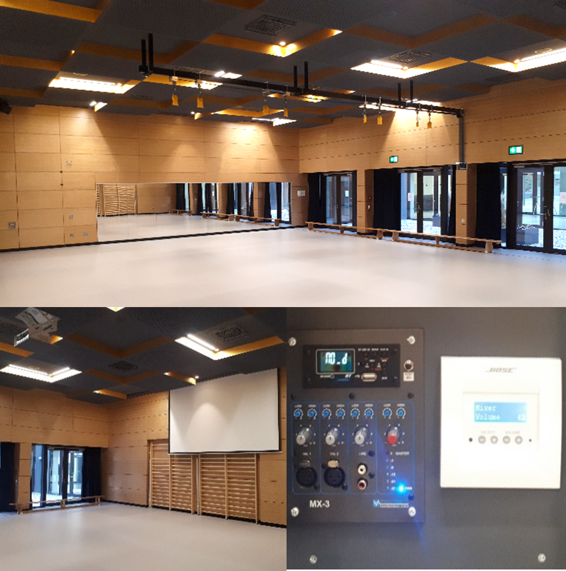 Hier sind zusätzlich zur Audioanlage noch ein Deckenbeamer und eine Leinwand verbaut